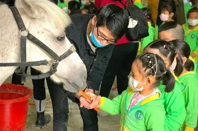 当天,50余名幼儿园小朋友走进马场,依次完成体温测量和消毒后,在马场讲解员带领下,体验马术体验项目,讲解马的生活习性、投喂互动注意事项等。活动现场,观看马术表演、给马儿喂食、亲身马背试骑……一系列有趣的互动环节,让孩子们零距离感受到人与马相处的奇妙情感。“有点害怕,不敢骑。”5岁的罗泽瑞看到眼前的高头大马,十分兴奋,却总躲在远处。观看马术俱乐部小会员骑乘表演后,他鼓起勇气,和马术教练一起完成了骑马体验,“骑马很好玩。”