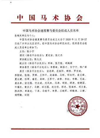 中国马术协会秘书长钟国伟在大会上正式公布了中国马术协会速度赛马委员会的组织架构,并公布了委员会组成人员名单——