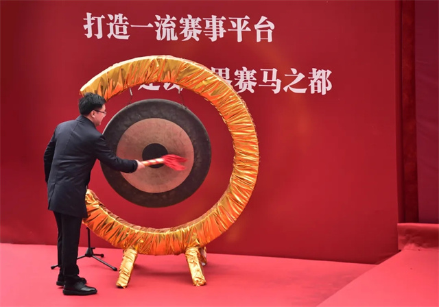 图:4月3日2021年中国速度赛马公开赛(武汉站)开幕式现场,武汉市人民政府副秘书长李涛敲响开赛铜锣