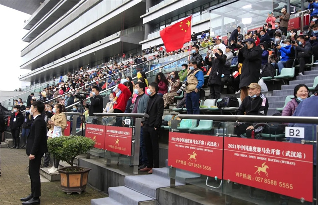 “打造一流赛事平台,建设世界赛马之都”——4月3日武汉东方马城国际赛马场成功举办2021年中国速度赛马公开赛(武汉站),开幕仪式主舞台上的16字标语显露出武汉对于赛马的重视。