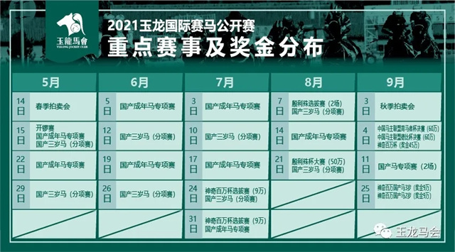 以下公布的为玉龙5-6月份赛程安排,可以看出前7个赛马日国产马的比赛多达13场,具体以玉龙马会赛事部公布的信息为准——