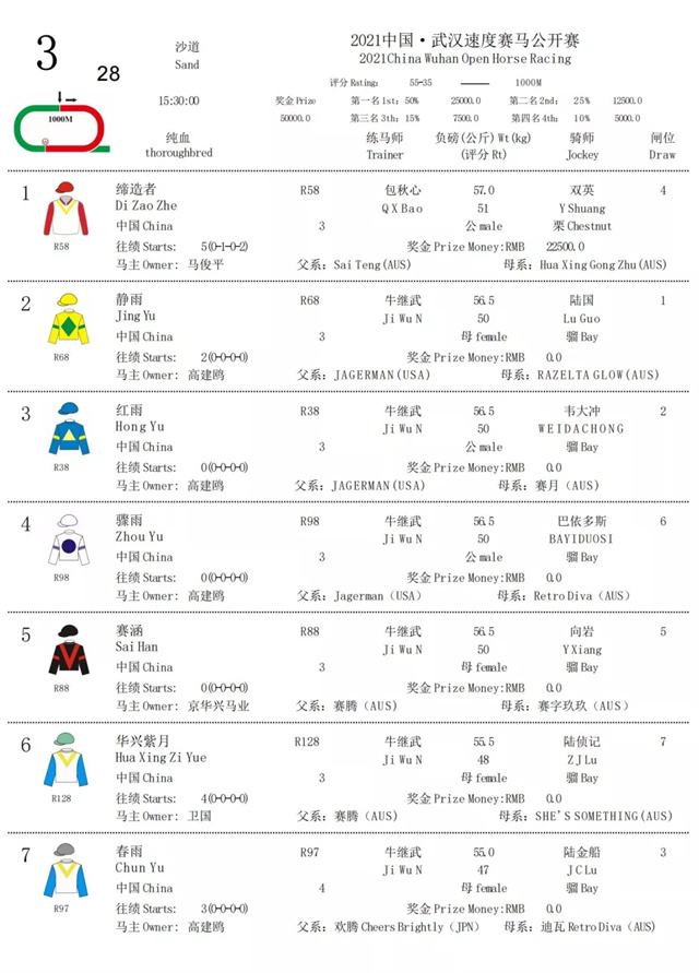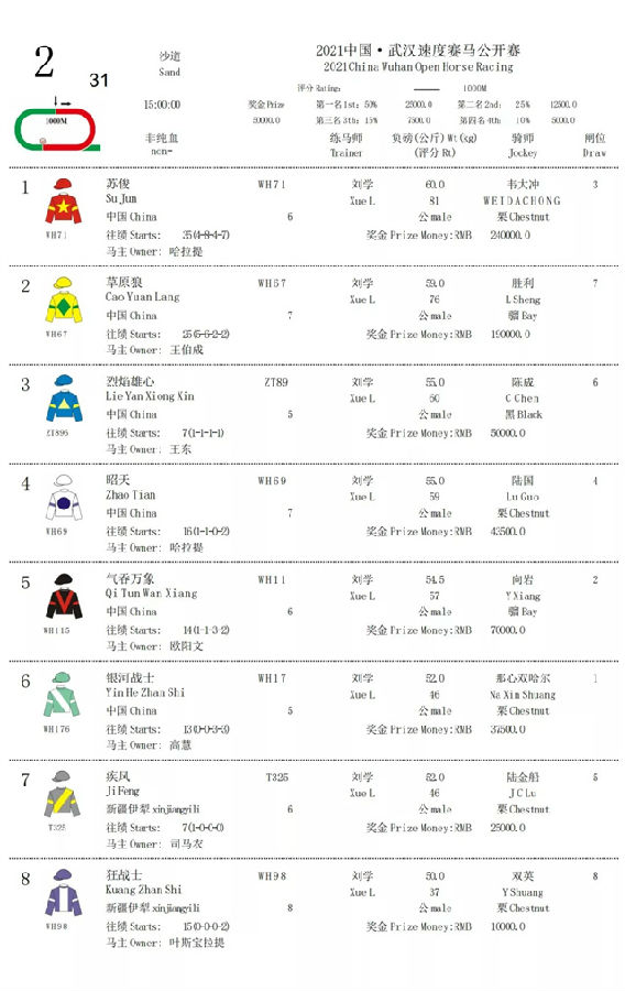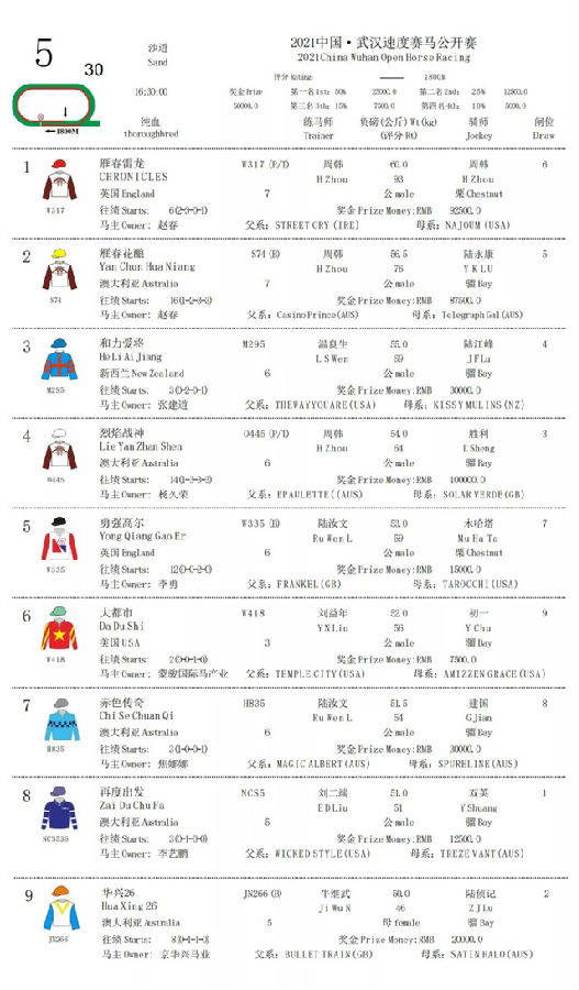 2021赛季的中国·武汉速度赛马公开赛继续在武汉市政府的大力支持下举办。今年武汉赛马的首场比赛也极具意义:4月3日下午,2021年中国速度赛马公开赛(武汉站)在东方马城国际赛马场顺利举行。这是国内牛年首场正式的高规格纯血赛马比赛,也是武汉赛马首次以国家级赛事开赛。更为重要的是,这是中国马术协会首次推出的级别赛——属中马协三级赛。