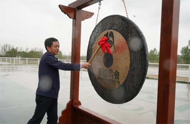 图:4月3日2021年中国速度赛马公开赛(武汉站)开幕式现场,武汉市人民政府副秘书长李涛敲响开赛铜锣