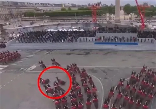 在这次阅兵中,龙骑兵队伍的出场还是帅气无比的。但是,在香榭丽舍大街的尽头,接近阅兵主席台的时候,需要骑兵队伍分开向两侧转弯,这时候不知道是大街上的路面不平还是其他原因,2名骑兵加乘的战马突然受惊,不受控制,纷纷倒地,把2名骑兵也摔到地上,这个摔一定伤的不轻。但法国电视解说员还不忘自嘲:这真是两匹有个性的马。