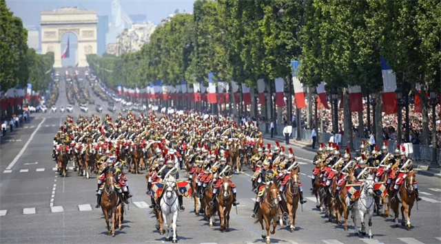 今年的法国阅兵共有5000余人参加,包括4300名步行接受检阅的军人、73架飞机、24架直升机、221辆军车以及200匹龙骑兵的骏马。