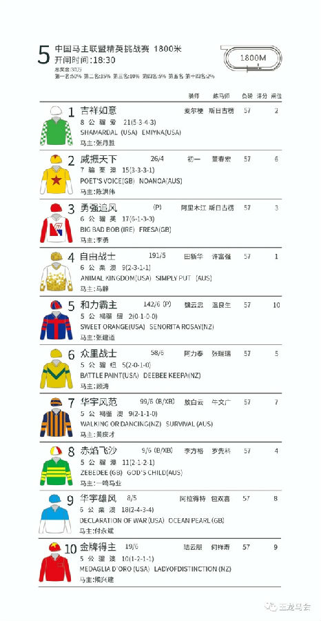 5号马“和力霸主”是昔日于谦领衔的“大谦世界明星马主团”旗下的明星赛驹“大谦十一郎”,在2019全国速度赛马锦标赛3岁马2000米赛事力战群雄夺得冠军。疫情期间长时间没有比赛,易主和力马业后,“和力霸主”状态回升明显,在1800米途程有竞争优势。