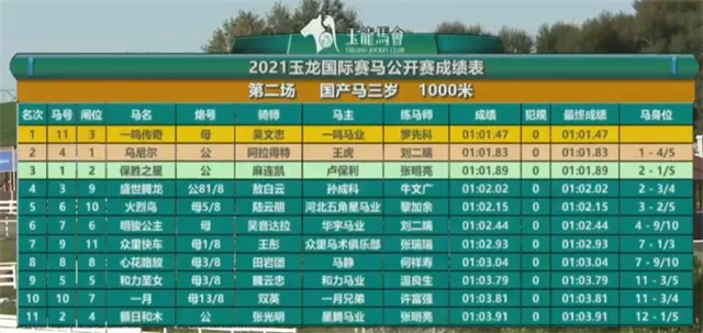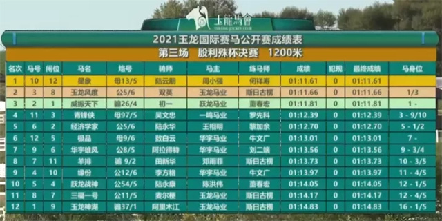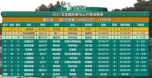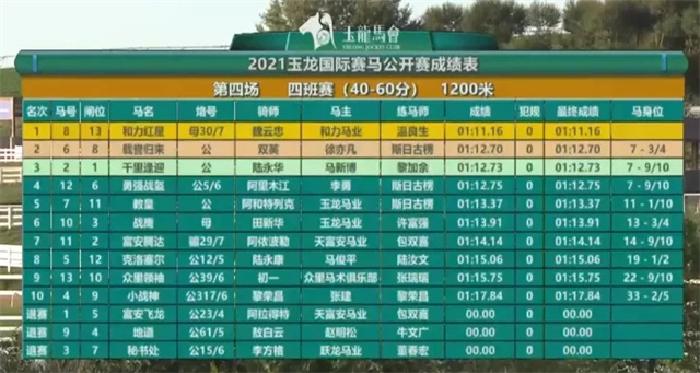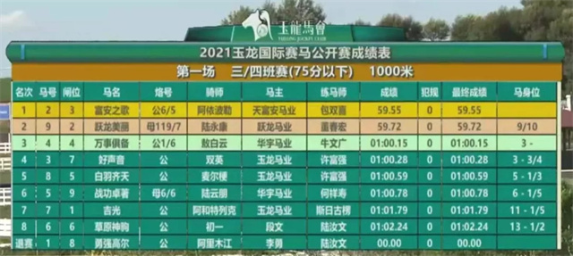 天富安马业旗下赛驹“富安之歌”在今天首场途程1000米赛事中再次夺冠,在玉龙赛场两战全胜!在奖金10万元的国产三岁马1000米赛事中,一鸣马业旗下的“一鸣传奇”在骑师吴文忠策骑下全程领放精彩夺冠。在第四场四班赛(40—60分)途程1200米赛事中,“和力红星”以巨大优势顺利斩获本赛季玉龙赛场的第二个冠军。最后一场途程1800米的赛事中,华宇马业旗下赛驹“一脉相承”精彩夺冠。