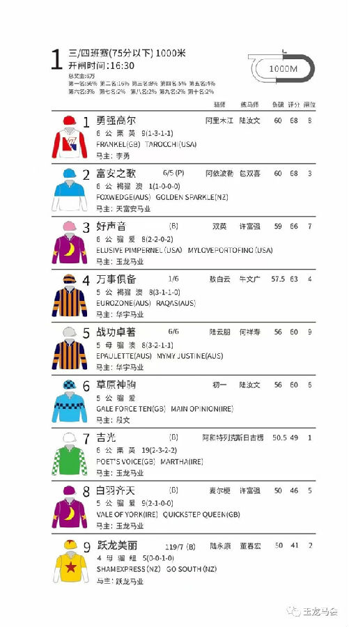 第一场:三/四班赛(75分以下)1000米 奖金6万