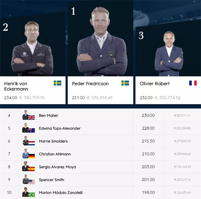 图:2021环球马术冠军赛年度排名前十骑手和赛季奖金一览