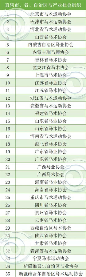 据中国马会标准化管理委员会、中国马会秘书处整理发布的公开数据显示:截至目前,在各级民政部门进行了正式注册登记的全国马产业社会组织共220家,其中国家马产业社会组织2家(中国马术协会和中国马业协会),直辖市、省、自治区马产业社会组织共35家,地级市、区、自治州、盟马产业社会组织共95家,县、区、旗马产业社会组织共88家,其中内蒙古自治区马产业社会组织数量最多(共58家),湖南、江西、辽宁尚无省级马产业社会组织。