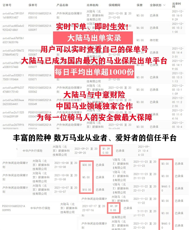 大陆马也非常荣幸可以为广大爱马人、从业者尽可能多的提供一份安全保障。承蒙全国各地爱马人的支持和信任,通过中意财险和中国相关马业保险机构的数据显示,大陆马已经成为中国马业从业者投保次数最多、金额最大、最为信任的专业马业保险投保平台,几乎每分钟都有出单记录——