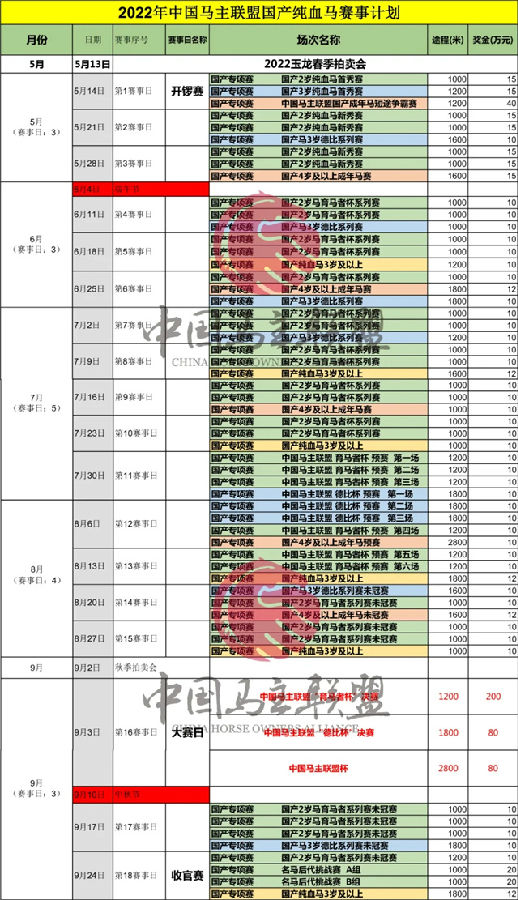 2022年中国马主联盟国产纯血马赛事计划说明: