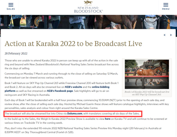 * 新西兰纯血马公司在官网上,向全球发布了邀请大陆马平台参与直播的新闻
