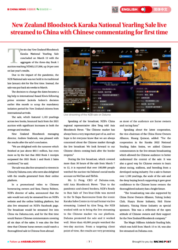 国际著名行业媒体英国Racingpost(赛马邮报)旗下“亚洲赛马新闻”本周整版报道了“新西兰全国周岁马拍卖会落幕,中文直播全程解说”专题文章:
