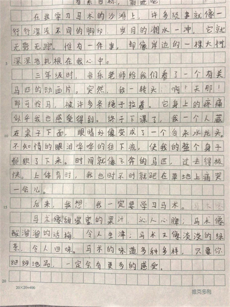谈到她是如何开始学习马术,为什么能坚持,而且进步神速的原因,热情开朗的沈紫昕告诉我一堂音乐课的启发。她当时说得声情并茂,非常生动,我灵机一动就让她把自己当时的感受写出来。她欣然答应,很快就发给了我。于是,关于这几个问题,请看下文(沈紫昕来稿):