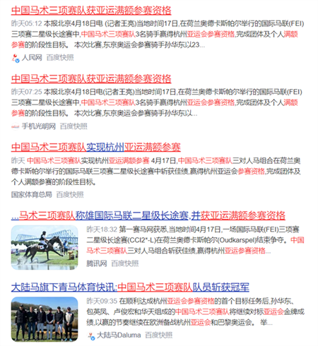 近日,人民网、人民日报、光明网、国家体育局多平台报道《中国马术三项赛队获亚运满额参赛资格》。中国马术三项赛队的三名骑手孙华东、包英凤和卢俊宏携手参赛,经过为期三天的三个项目(盛装舞步赛、越野赛和场地障碍赛)的角逐后,均取得优异成绩。帮助中国队锁定了团体参赛资格和个人参赛资格,并达成满额参赛的阶段性目标。