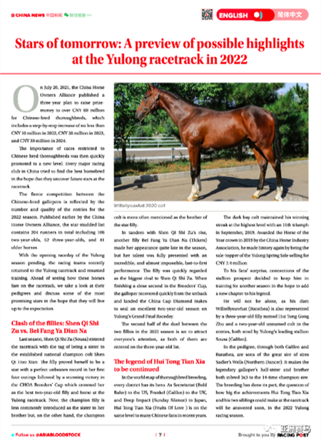 近日,国际著名行业媒体英国Racingpost(赛马邮报)旗下“亚洲赛马新闻”整版报道了《2022玉龙赛场精彩看点预告》专题文章: