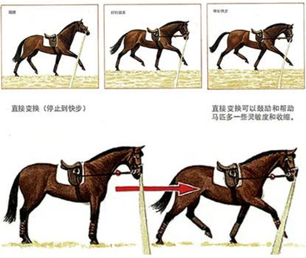 这里最普遍的问题是马匹也许会变得过度兴奋。如这种情况发生,就要使马匹再做快步并要等待马匹安静下来后,再重试。你能通过在圈线上开展这项工作来要求步伐伸长。