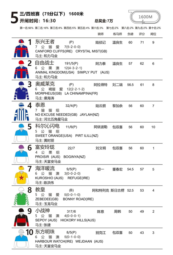 首场赛事是途程1200米、奖金5万元的五班赛(45分以下),14匹赛驹满闸出战,汇聚了玉龙马业、华宇马业、众里马业、天富安马业,以及赵春、牛福东、岳文磊、王相明、宋春雨等马主的赛驹,其中马主宋春雨旗下赛驹“昆仑决”在上周的开锣赛未冠赛(50分以下、途程1000米、奖金6万元)的赛事中刚刚夺冠。