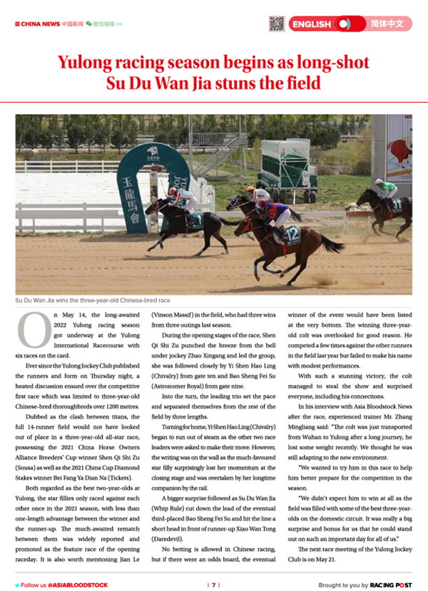 近日,国际著名行业媒体英国Racingpost(赛马邮报)旗下“亚洲赛马新闻”整版报道了《玉龙赛场顺利开锣,惊喜花落“速度玩家”》专题文章: