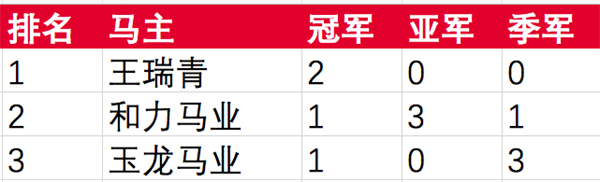 说明:本周5场赛事结束后,马主王瑞青仍然以上周2场赛事冠军暂列榜首,和力马业和玉龙马业本周则凭借多场赛事中的亮眼表现排名上升至前三。