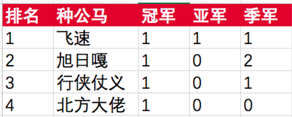 说明:本周5场赛事中又新添5匹头马,10匹各场冠军马匹分别以1场冠军并列第1,随着赛事进行,并列格局有望打破。