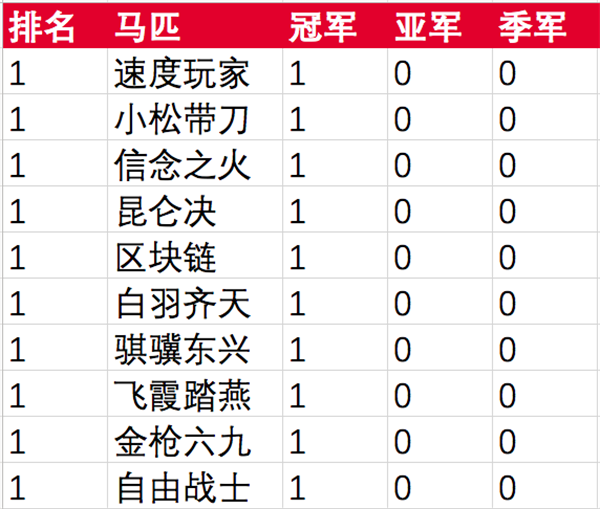 排行榜说明:根据本赛季各场赛事结果,中国马主联盟统计冠亚季军累积获得次数,并对马匹、马主、练马师、骑师以及种公马分别进行排名,并对排名靠前的名次进行公布,以示嘉奖。(其中种公马仅统计中国马主联盟认证种公马。)