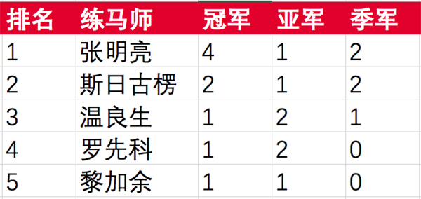 说明:本周练马师张明亮继续优异表现,收获2冠1亚将领先优势拉大。斯日古楞则凭借两场冠军将排名追至第二,温良生、罗先科和黎加余则以一冠紧随其后。