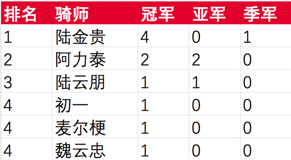 说明:本周骑师排名中陆金贵新增2场冠军,以4冠1季继续称霸榜首,阿力泰拉开与陆云朋差距分列二三,初一、麦尔梗魏云忠则各以1冠并列第4。
