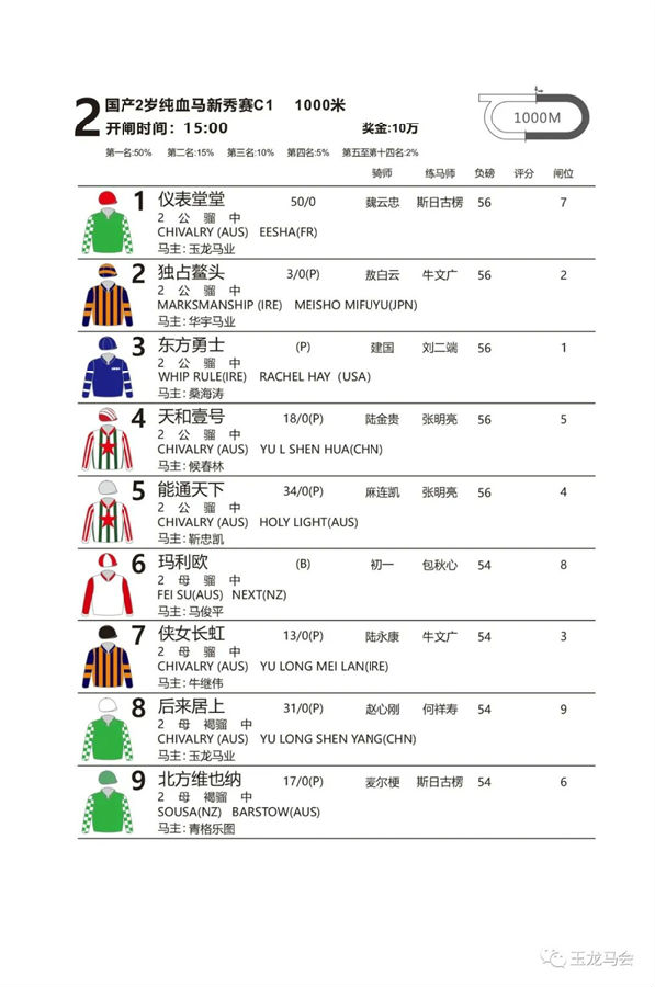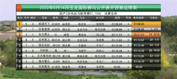 C1组“天和壹号”退赛,最终8匹赛马沙场争雄!玉龙马业中国马主联盟认证种公马"行侠仗义”子嗣 “能通天下”(父系“行侠仗义”Chivalry;母系Holy light)在骑师麻连凯策骑下旗开得胜,拿下C1组头马!