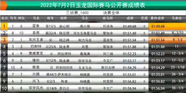 本场比赛作为“星象”新赛季的首场比赛,是她首次挑战1600米的距离,赛事早段“星象”从6号闸出闸后居于马群中间,最后直路时发起反超,成功超越早段前领马匹“缘分”,以10个马位的绝对优势领先亚军“泰恩”夺冠,“东兴王者”则跑入位置,夺得季军。