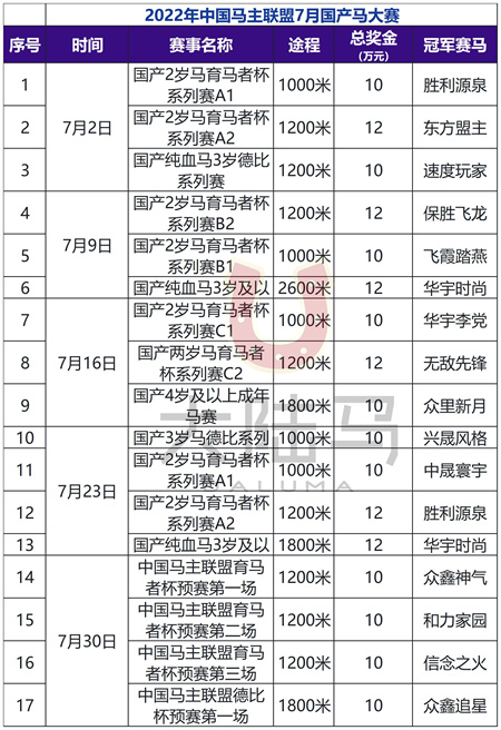 7月5个赛事日,17场中国马主联盟国产马大赛,奖金额达182万元。无论是赛事数量,还是奖金额都有大幅提升。