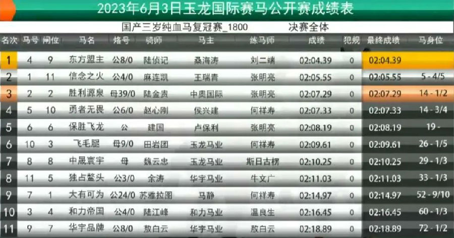 最终,“东方盟主”突破重围,率先冲过比赛终点!“信念之火”获得第二名;中奥国际麾下“胜利源泉”位列第三。