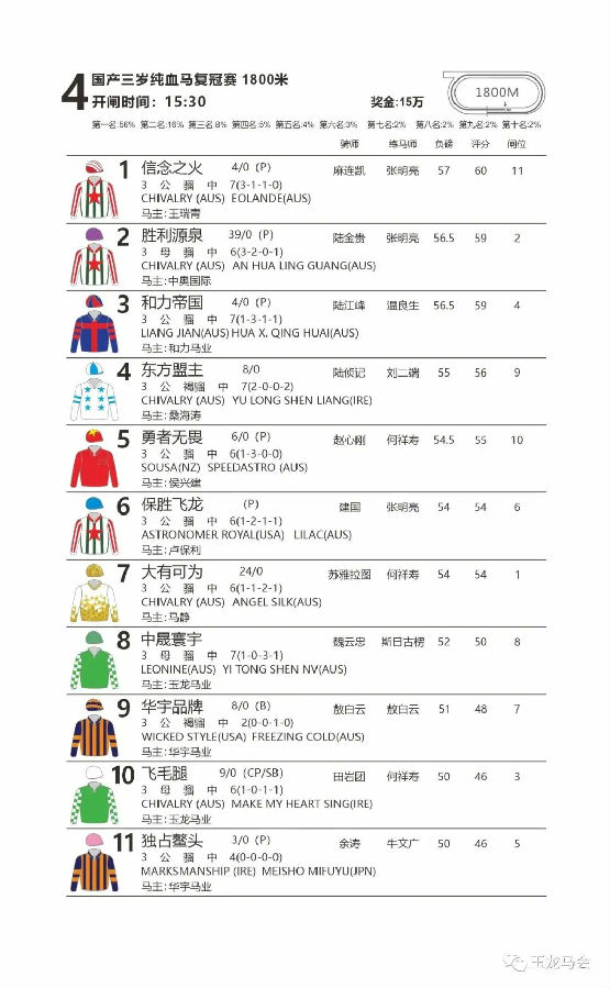 第四场比赛途程1800米、总奖金15万元的国产三岁纯血马复冠赛在15:30正式开赛!本场赛事共有11匹“悍将”同场竞逐,并且众星云集,其中有9匹是已在玉龙赛道上斩获冠军的名将,本场比赛再次出征证明自己!
