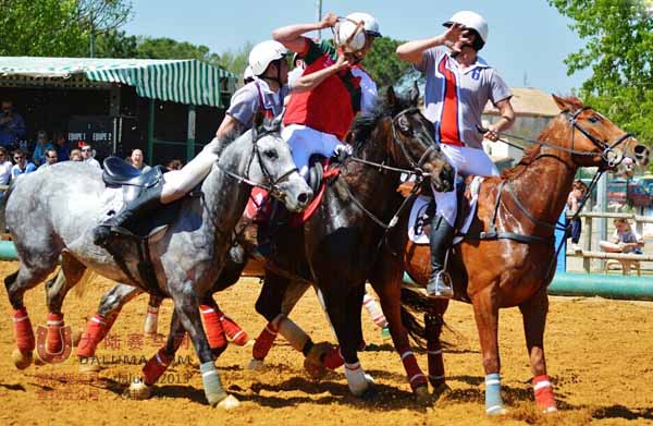 由于比赛条例规定:参赛者双足不得触及地面,所以球员均需从马背上弯腰俯身夺球,导致在比赛过程中惊险百出,险象丛生,吸引着众多的观赛者。