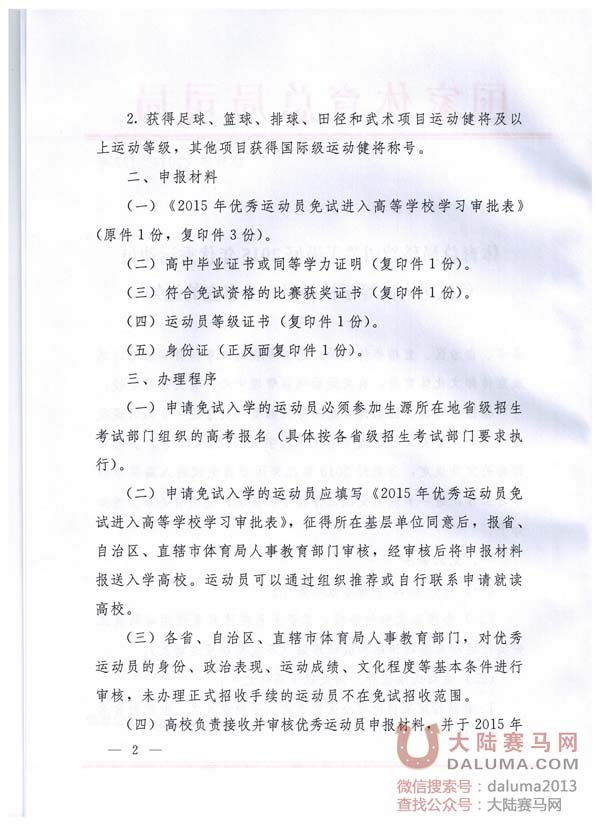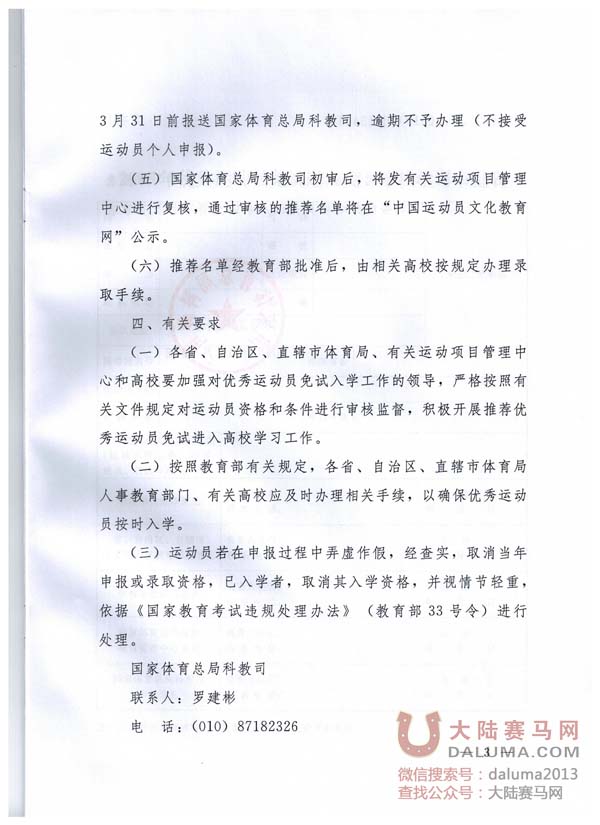 (三)各省、自治区、直辖市体育局人事教育部门,对优秀运动员的身份、政治表现、运动成绩、文化程度等基本条件进行审核,未办理正式招收手续的运动员不在免试招收范围。