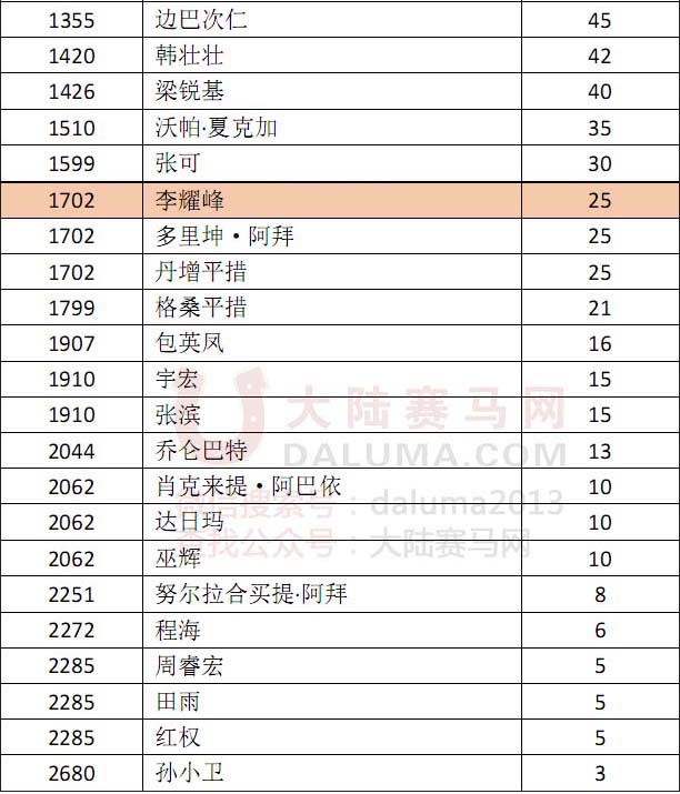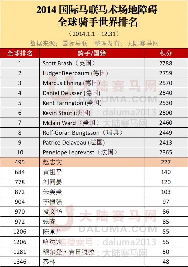 2014全球马术场地障碍骑手排名公布 赵志文中国第一