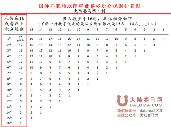 参赛骑手满16人或者16人以上时,大家看图片的左侧红色框里的部分,第一名20分,第二名17分,……以此类推;