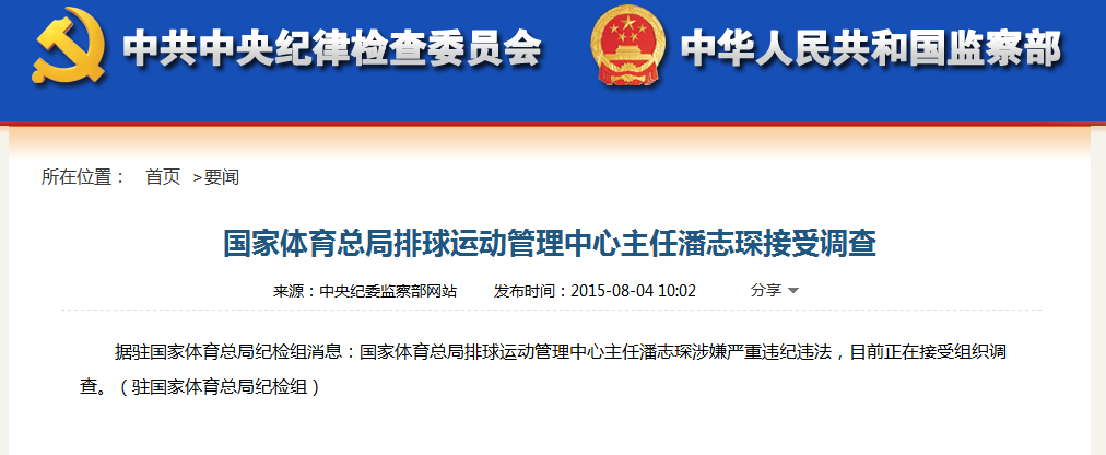 据中央纪委监察部网站4日上午消息,国家体育总局排球运动管理中心主任潘志琛涉嫌严重违纪违法,目前正在接受组织调查。随后,国家体育总局党组研究决定,免去潘志琛的排球运动管理中心主任、党委副书记职务。