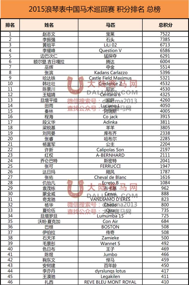 2015中国马术巡回赛骑手积分总排行榜出炉:赵志文第一