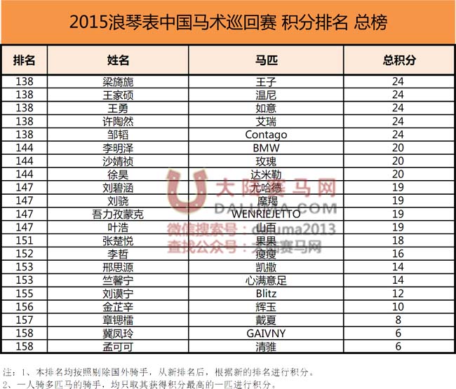 大陆赛马网 > 即时资讯 > 即时资讯 > 2015中国马术巡回赛骑手积分总排行