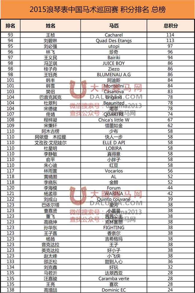 2015中国马术巡回赛110-115cm骑手积分排名:石天洋第一