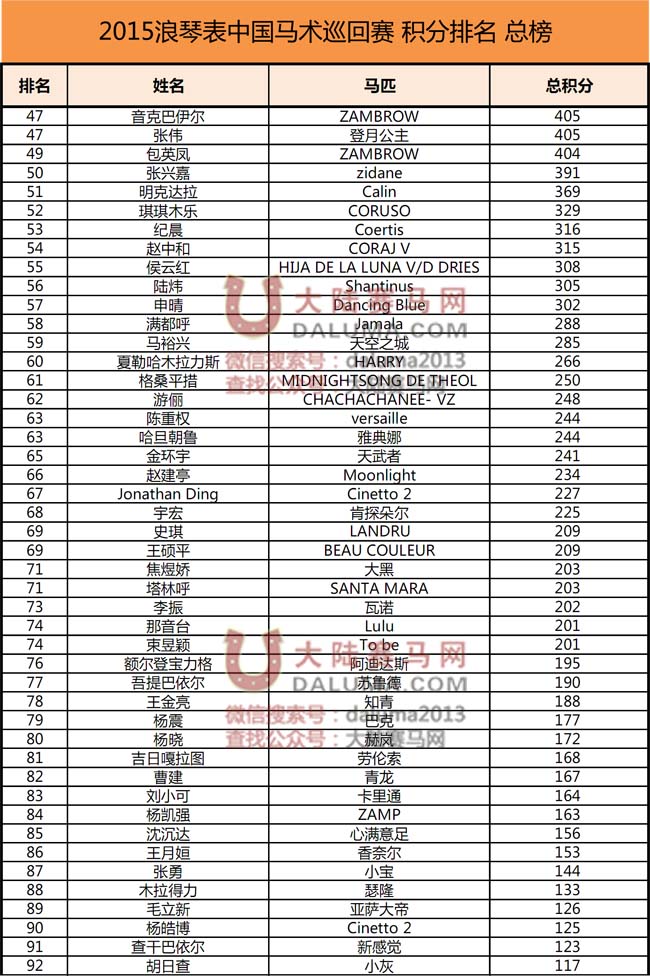 根据2015年已举办的中国马术巡回赛前三站成绩,并以中国马术协会制定的骑手排名积分办法为依据,中巡赛赛事组委会制定了2015年中巡赛骑手积分排行榜,分别为60-90CM级别(38人,王桢第一)、100-115级别(72人,石天洋第一)、120-130级别(58人,张佑第一)、145-150级别(28人,黄祖平第一)以及骑手积分总排行榜(159人,赵志文第一)。2015浪琴表中国马术巡回赛香港赛马会杯广州总决赛将按照此排行榜的排名顺序优先接受报名。