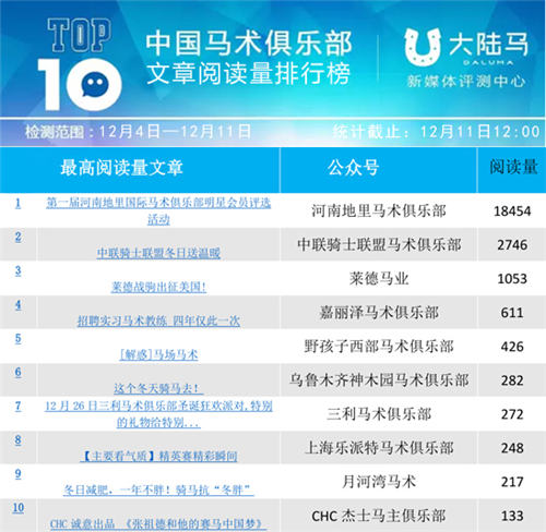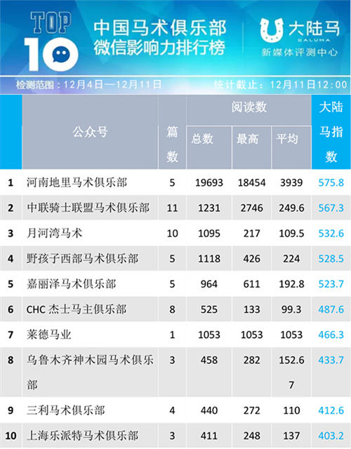 中国马术俱乐部微信影响力排行榜TOP10|12月14日周榜