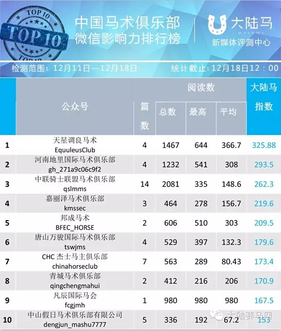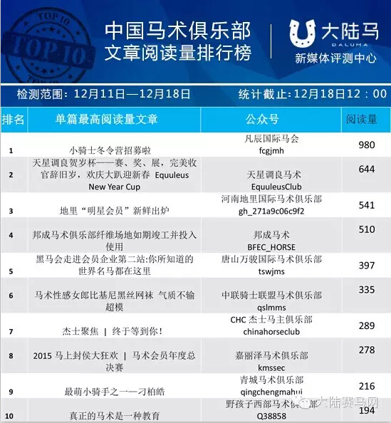 中国马术俱乐部微信影响力排行榜TOP10|12月21日周榜