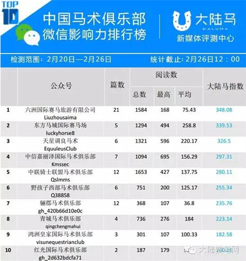 每期榜单由大陆马新媒体数据评测中心编制,依据各俱乐部微信数据、大陆赛马网PC端网站、大陆马APP、大陆赛马网微信、微博、搜索引擎(百度&谷歌)的搜索指数等客观数据以及产生的社会影响力、知名度综合评判,推出《中国马术俱乐部微信影响力排行榜》及《微信单篇阅读量最高文章》排名的榜单。力求助力马术俱乐部经营者们在“互联网+体育”的潮流下共同为俱乐部的业务提升探索新方向。