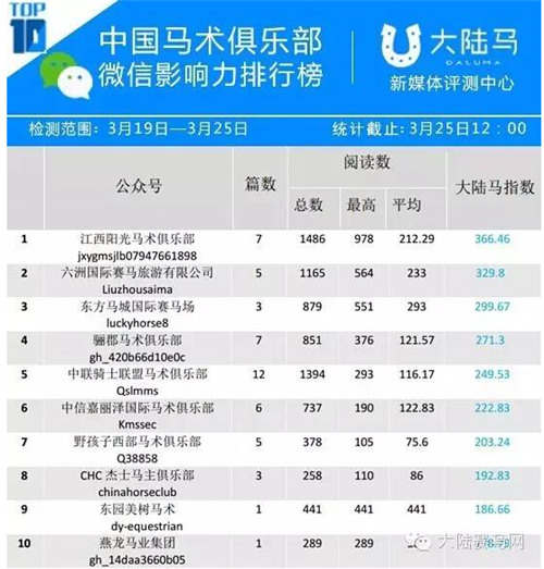中国马术俱乐部微信影响力排行榜TOP10|3.28总第16周