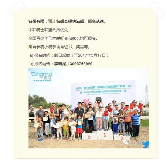 2017年3月18日,青马乐园全国马术趣味推广赛第二站,将在北京中联骑士联盟CKUR国际马会举办。这是全国首个以推广马术兴趣为主题、以青少年为唯一核心的赛事,家长和孩子均可参与的赛事,由大陆赛马网主办,中联骑士联盟、青马承办,优酷和乐视将全程现场直播。