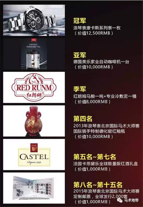 本年度“鸟巢之路”·冠军杯马术巡回赛”4月+7月+11月三场赛事积分排名前十五位骑手,将在年度积分统计后赢取浪琴表、德国美乐家咖啡机、红朗姆马粮等更多惊喜。