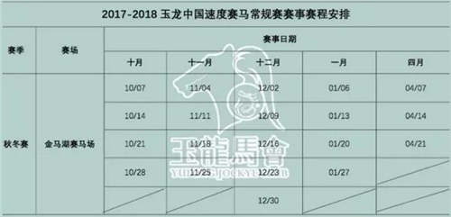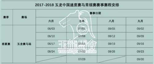 玉龙马会速度赛马常规赛定于2017年6月3日——2018年4月21日举行,全年共计38个比赛日,每周六为赛事日,每个赛事日五场比赛,全年共计190场比赛。常规赛分为春夏季赛和秋冬季赛,自2017年6月3日-2017年9月30日为春夏季赛,竞赛地点为山西右玉玉龙赛马场;2017年10月7日-2018年4月21日为秋冬季赛,竞赛地点为成都温江金马湖赛马场,其中,2018年2月、3月为赛事休赛期。